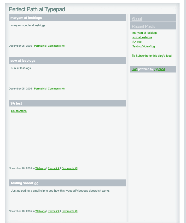 Typepad dies today.  I worked out that I only used it to experiment with video at the end of 2005, so I'm not scrabbling to make a proper archive, there's only enough to merit a screenshot :). The lesblogs would have been the second one where we got a lecture in 'civility' from Mena Trott who co-founded Six Apart, the makers of Typepad.  Videoegg, referenced in the post at the bottom of this picture, went on to buy Six Apart (keeping Typepad but selling off Movable Type).